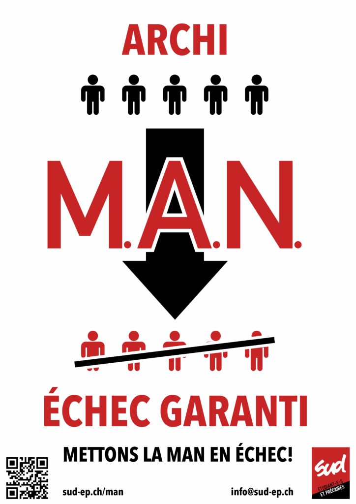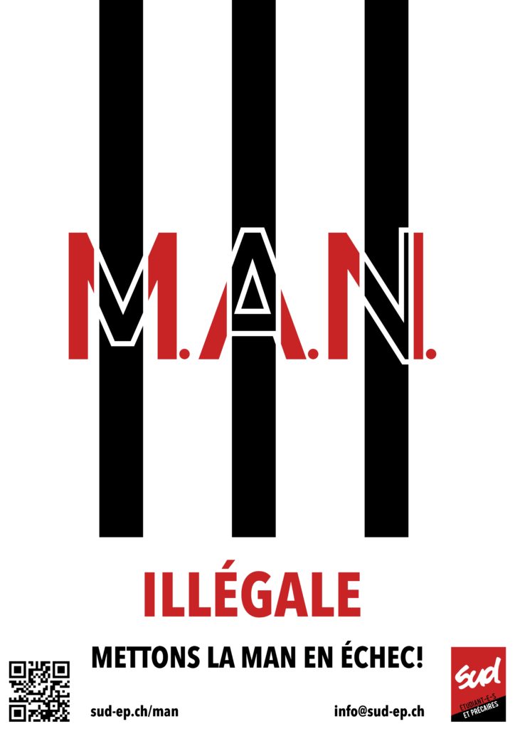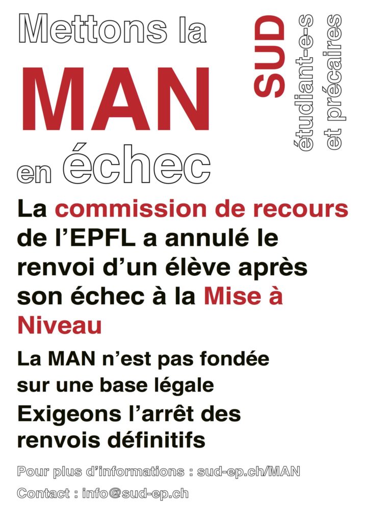 Le semestre universitaire avance, les prochains envois forcés à la MAN approchent, nous avons décidé de faire campagne pour exiger de l’EPFL qu’elle cesse d’imposer aux étudiant·e·s de suivre ce cours éliminatoire, et annule, pour celles et ceux qui choisiraient la voie de la MAN, les renvois immédiats en cas d’échec. Nous avons adressé aujourd’hui une lettre au directeur de l’EPFL. Nous lançons de plus une campagne d’affichage massif et de distribution de tracts pour informer les élèves, surtout ceux de première année qui sont en ligne de mire, et les inviter à se mobiliser contre ce système dysfonctionnel, injuste et illégal.