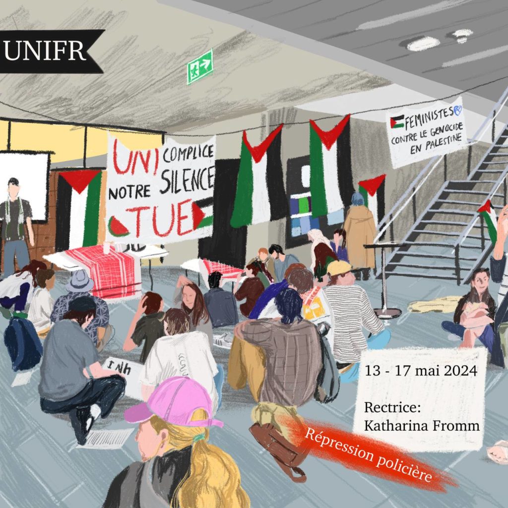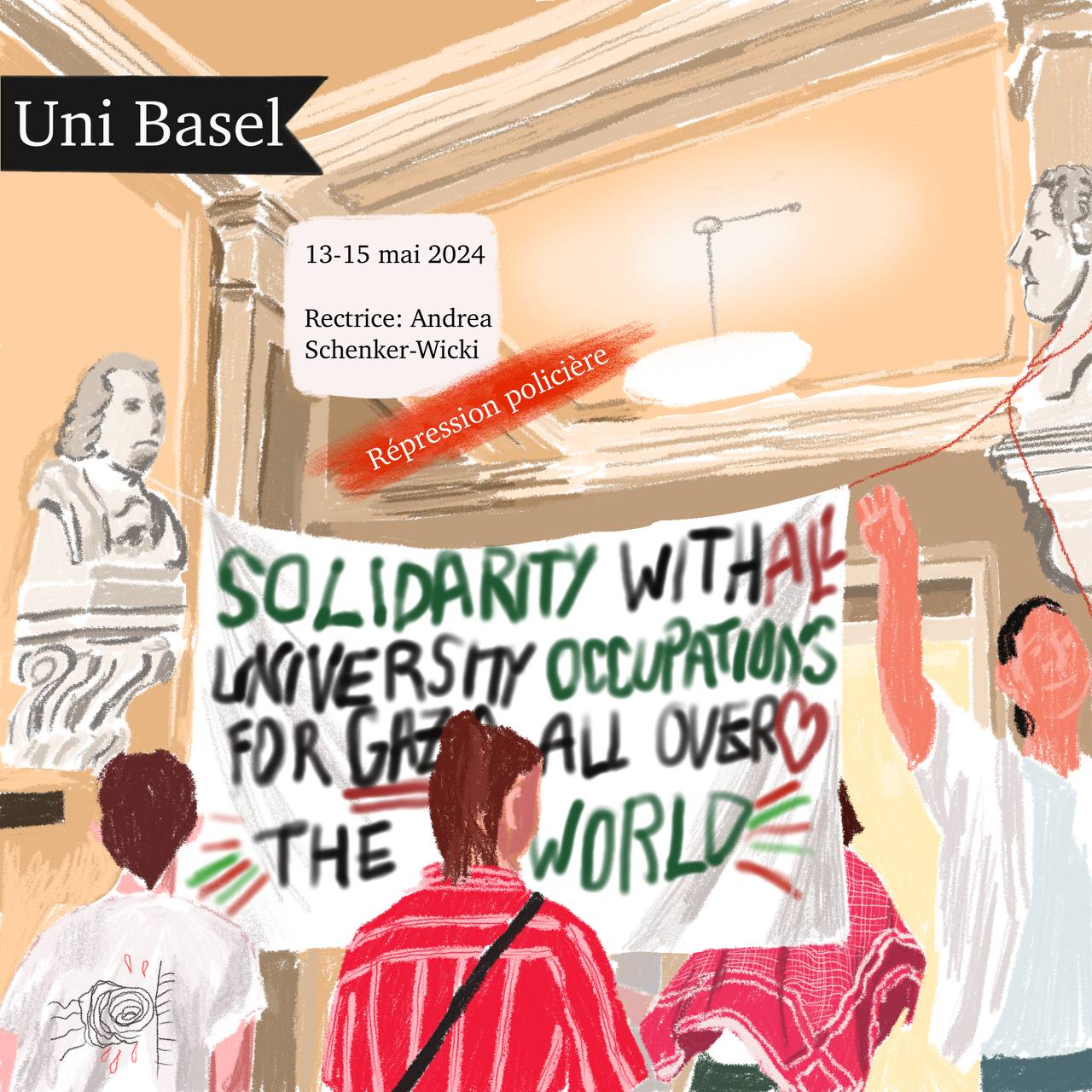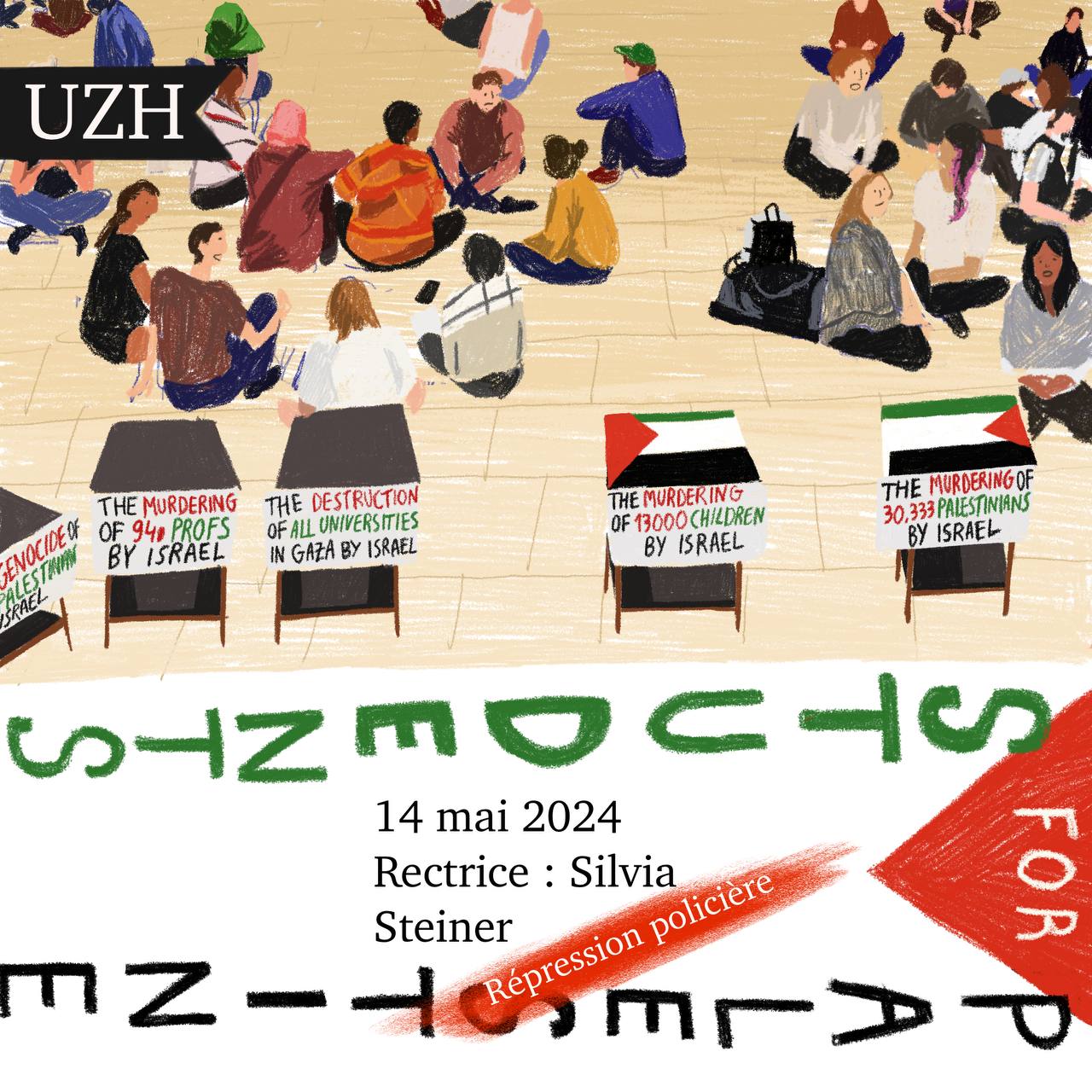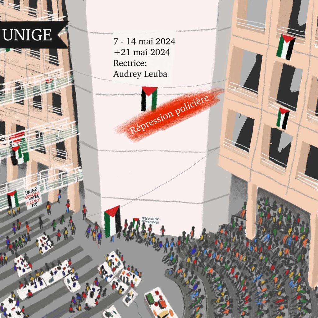 Palestine – Suisse : un mois de mobilisations étudiantes historiques. Retour en dessin.