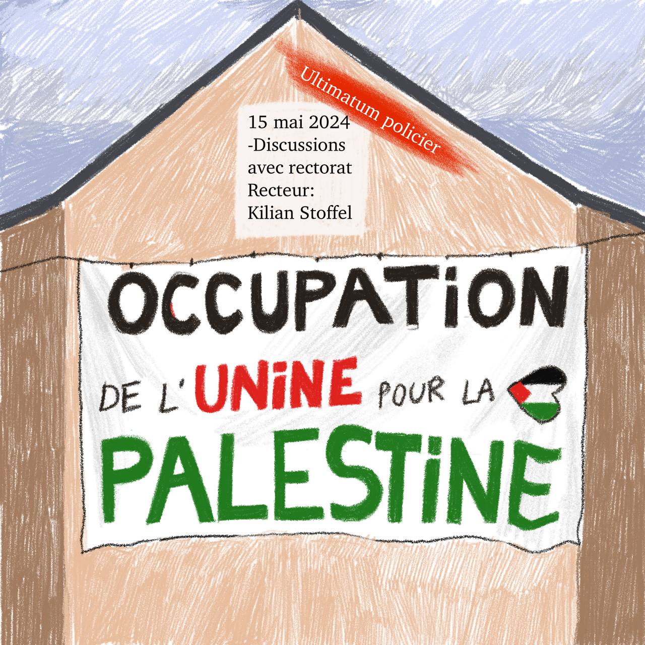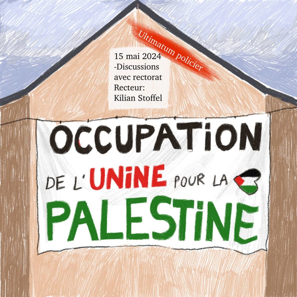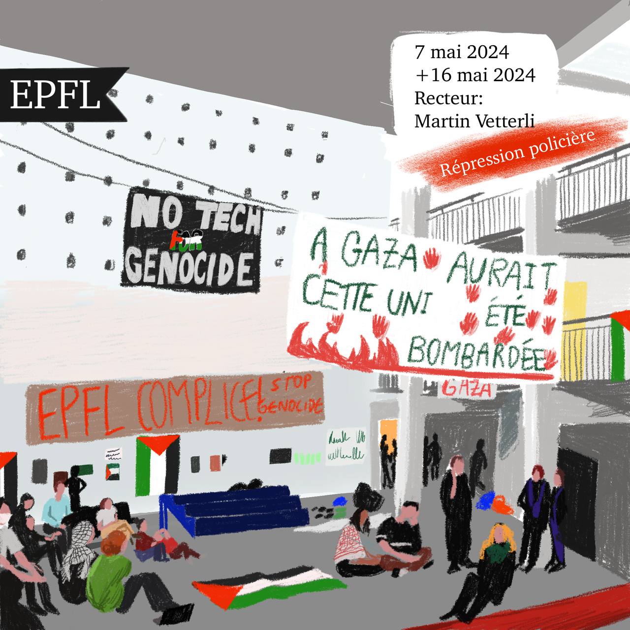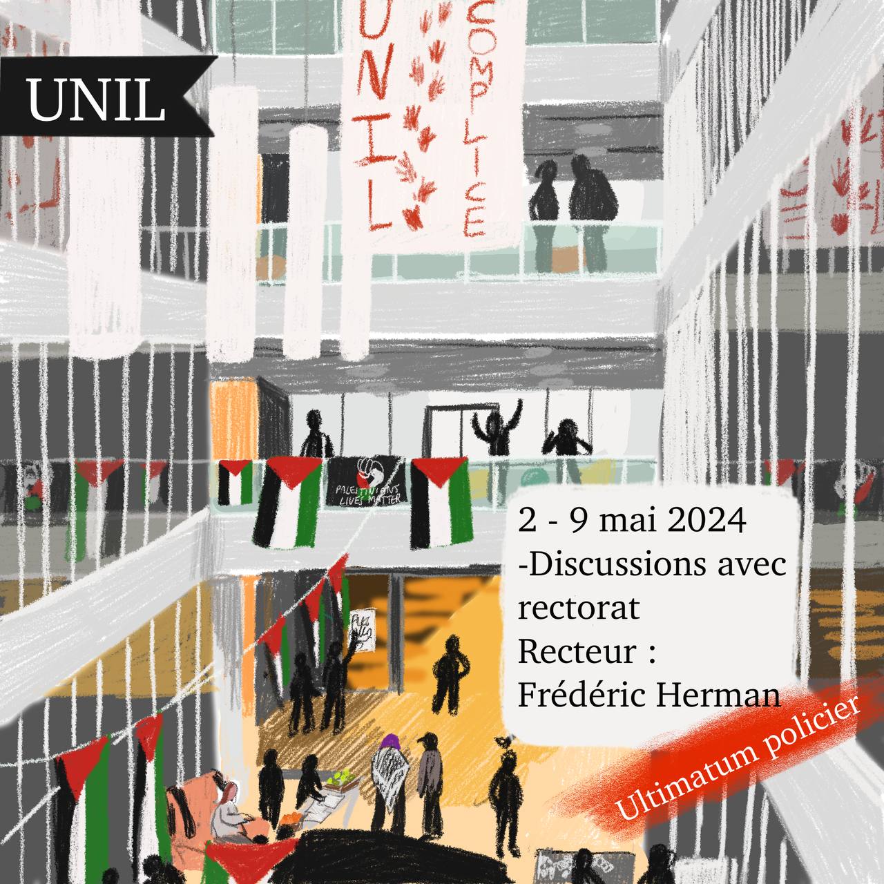 Nous restons engagé·es et déterminé·es pour des actions à venir ! La mobilisation est incontournable pour lever le voile sur ce que vivent les palestinien·nes : l’Apartheid et l’oppression quotidienne, le déni d’humanité. De plus, nous demandons que les institutions académiques de ce pays cessent toutes leurs collaborations avec l’État d’Israël. Nous ne tolérons pas que nos établissements de formation soient complices de ces crimes, même indirectement. Enfin, à l’heure actuelle, nous pensons qu’il est urgent de faire en priorité pression sur les autorités fédérales afin que la Suisse travaille activement à l’instauration d’un cessez-le-feu immédiat et permanent. Le bain de sang doit cesser.