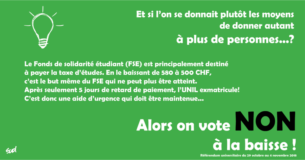 Ce lundi, dès 8h, toutes et tous les étudiant-e-s de l’UNIL se prononcent sur la baisse du montant maximal du FSE, grâce au référendum que nous avons lancé.