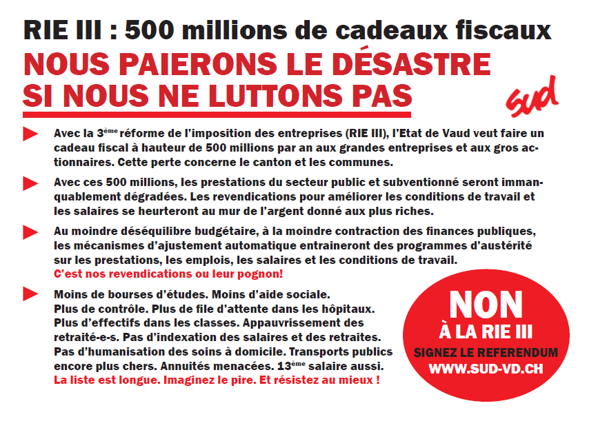 - Avec la 3ème réforme de l’imposition des entreprises (RIE III), l’Etat de Vaud veut faire un cadeau fiscal à hauteur de 500 millions par an aux grandes entreprises et aux gros actionnaires. Cette perte concerne le canton et les communes.