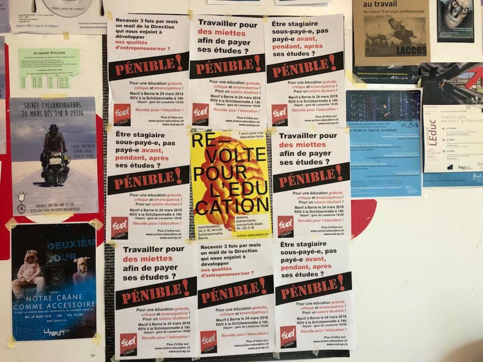Ajoutons les petits jobs où finissent toujours, par nécessité, les étudiant-e-s, et l’on verra l’ampleur de la misère financière dans laquelle nous sommes maintenu-e-s. S’en prendre ainsi aux étudiant-e-s, ce n’est pas simplement équilibrer un budget (de l’entreprise, de l’institution de formation, du Canton, …) où la dette menace toujours, c’est un paradigme : nous sommes les variables d’ajustement de politiques économiques, notre salaire est compressible à l’infini, jusqu’à zéro, notre travail n’est jamais reconnu. Nous n’avons aucune valeur parce qu’on ne nous considère pas comme travailleurs/euses.